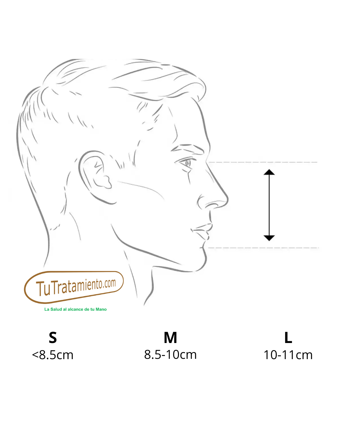 La Mascarilla Facial F5A está disponible en tres tallas diferentes: S, M y L. Para elegir correctamente tu talla, mide la distancia entre la parte inferior de la comisura de la boca hasta el puente de la nariz.