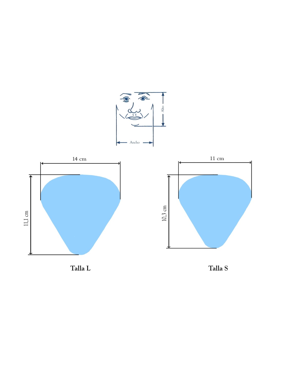 Disponible en tailles S et L. Pour choisir la bonne taille, il faut prendre deux mesures, comme expliqué dans le dessin : la distance entre le menton et l'espace entre les sourcils ; et la distance entre les deux articulations temporo-mandibulaires (sous l'oreille). Le rapport de taille est le suivant